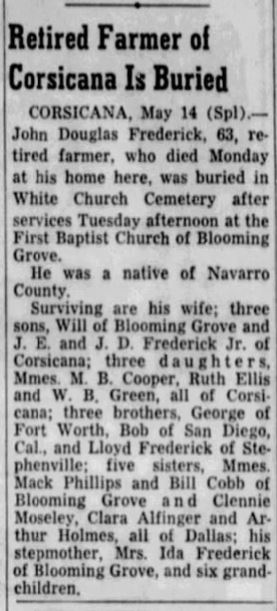 honorary educational fraternity, and Hood’s Brigade Association of Texas. He was a descendant of several early Navarro County pioneer families, namely Dr. W. S. Robinson, early day physician of Dresden, and Joseph Alvey Clayton of Chatfield, who served under Gen. Sam Houston at the Battle of San Jacinto in Captain Mesa Turner’s Company. He was also a descendant of Benjamin Franklin Lisman of Chatfield, who constructed the first metal bridge in Navarro County.
